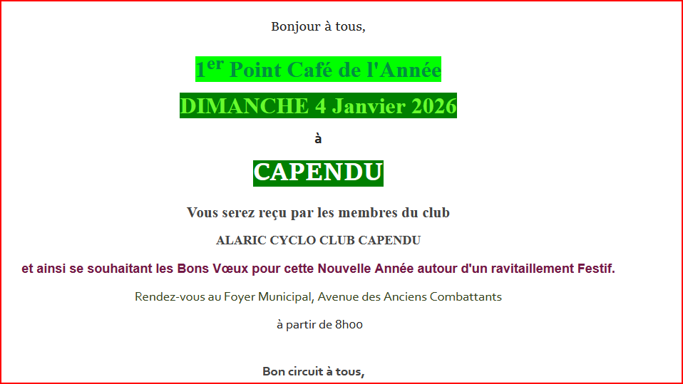 Dimanche 4 Décembre RDV au grand foyer Capendu 7h30